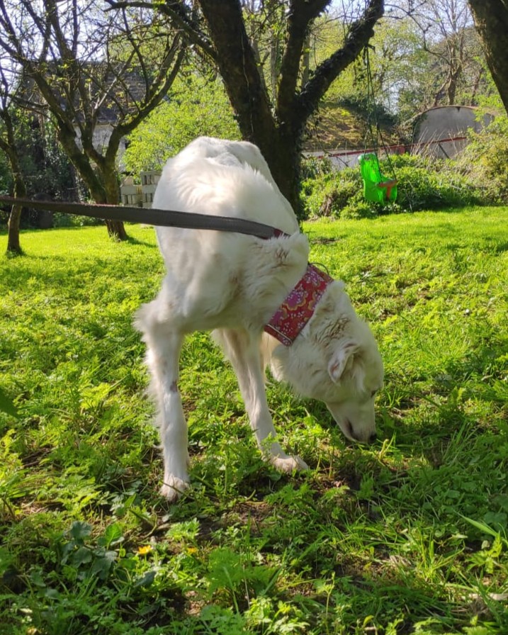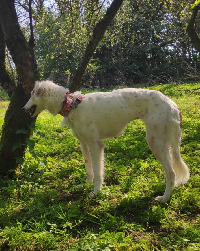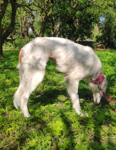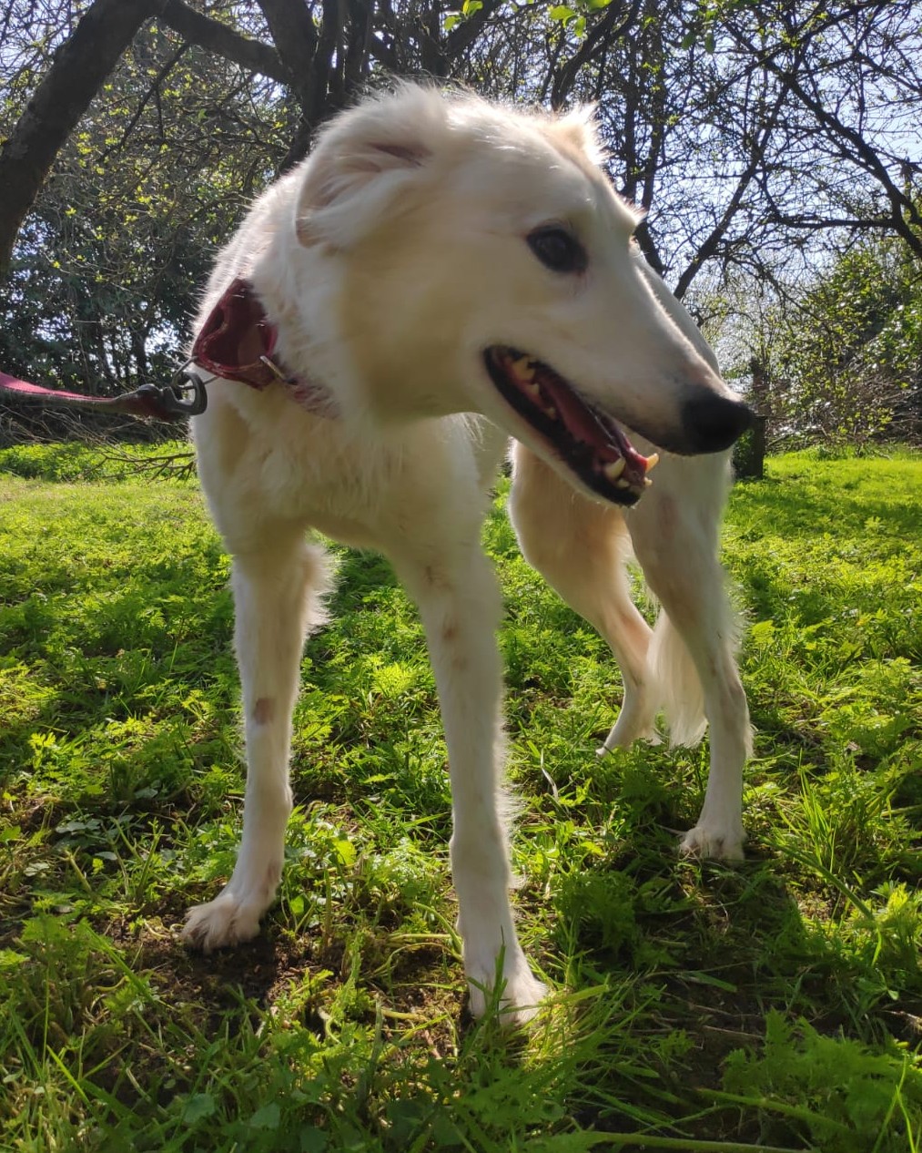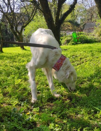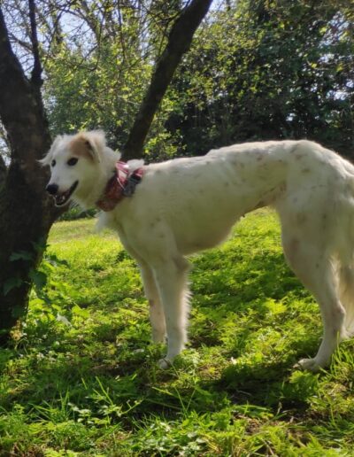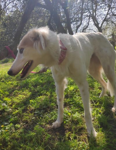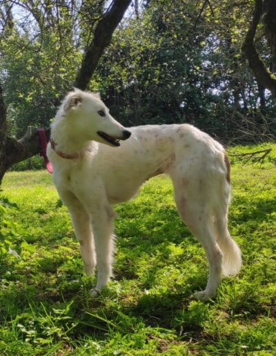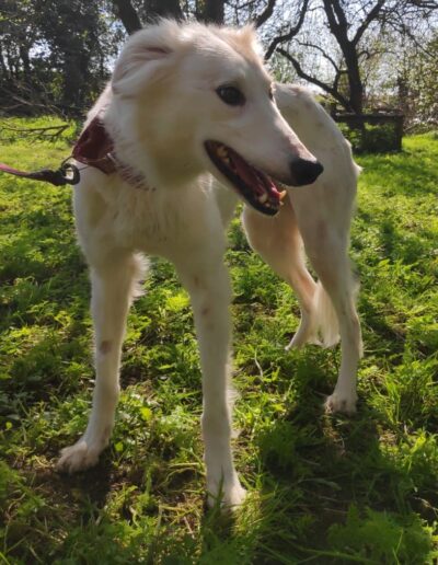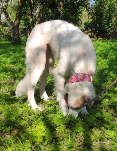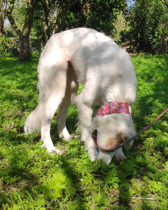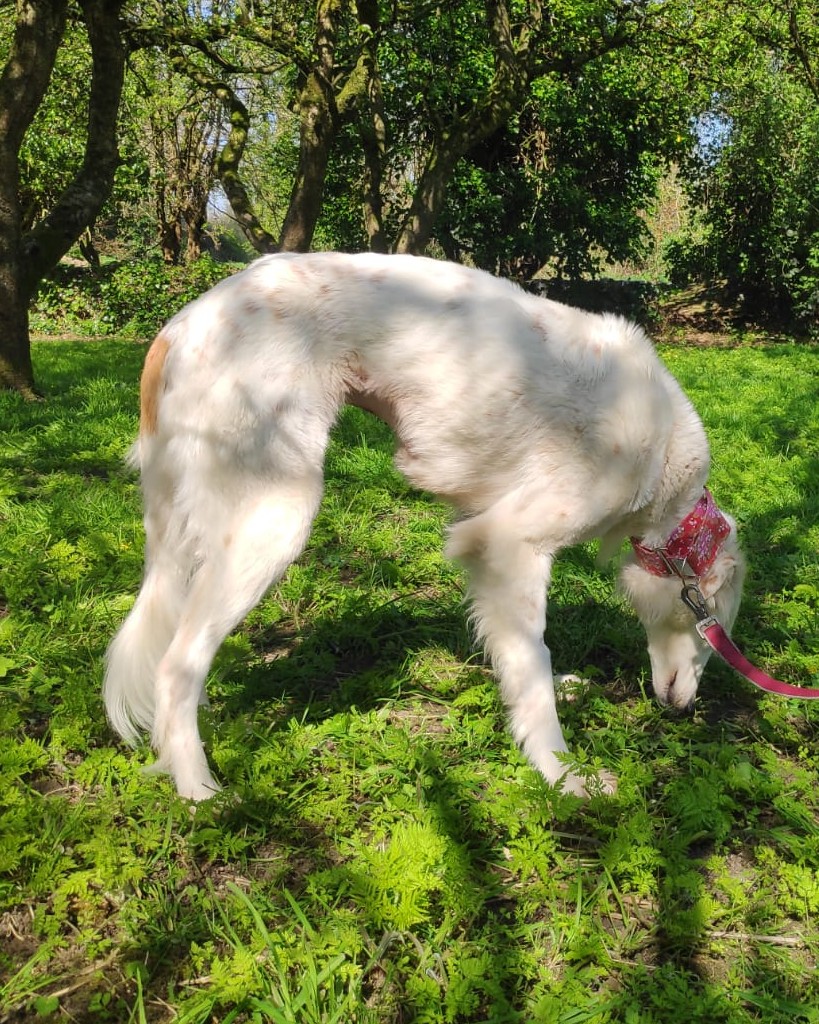A very calm girl, unfazed by things going on around her. Even busy roads and traffic are okay. She gets on well with all the dogs we have met, including two nervous and in-season female greys.